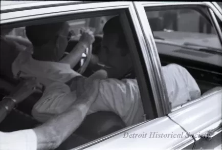 Black and white negative film taken on July 4th during the 1966 Gold Cup Race, on the Detroit River, of Mira Slovak, driver of the Gold Cup winner, TAHOE MISS, in an automobile, presumably on his way to the trophy presentation.