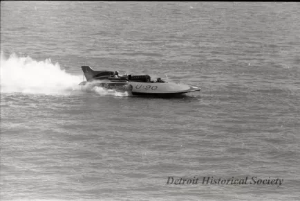 Black and white negative film taken at the 1965 Spirit of Detroit Race, of MISS SMIRNOFF, driven by Bill Cantrell. The boat finished thirteenth overall in the race.