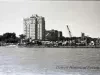Black and white negative film taken at the 1965 Spirit of Detroit Race, of the pits at the foot of Burns Avenue. It was the last year that the pits were located there. The Whittier Hotel can be seen in the background.