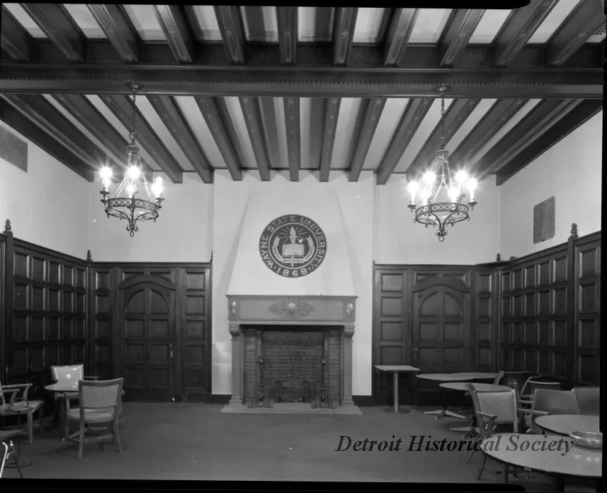 Black and white film negative of an interior view of the Mackenzie Hall student lounge; the room features a large fireplace; ornamental paneling and lighting fixtures; a crest affixed to the fireplace reads, "Wayne State University, 1868."