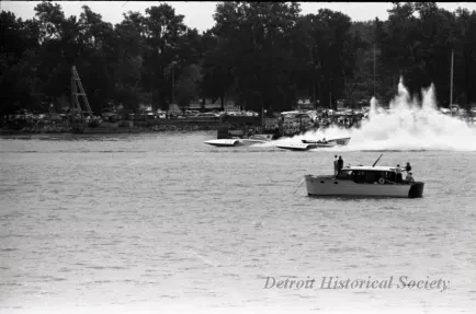 Black and white negative film taken at the 1967 World Championship Race on the Detroit River, of NOTRE DAME, at left, and ATLAS VAN LINES, at right, passing in front of the Detroit Yacht Club dock and spectator crowd.