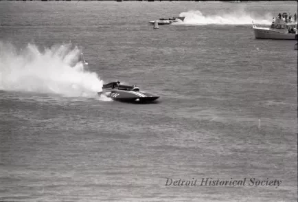 Black and white negative film taken at the 1967 World Championship Race on the Detroit River, of MISS U.S., during heat 1C. The boat, driven by Bill Muncey, finished second in the heat. Behind him is MISS LAPEER, driven by Warner Gardner, which finished third in the heat.