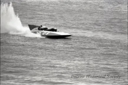 Black and white negative film taken at the 1967 World Championship Race on the Detroit River, of MISS LAPEER. The boat, driven by Warner Gardner, finished sixth overall in the race.