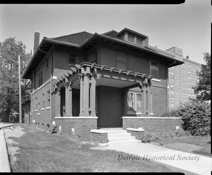 Black and white film negative of the Industrial Relations M.A. Program building at 5165 Second Avenue, on the campus of Wayne State University. In the background is the Chatsworth Apartments.