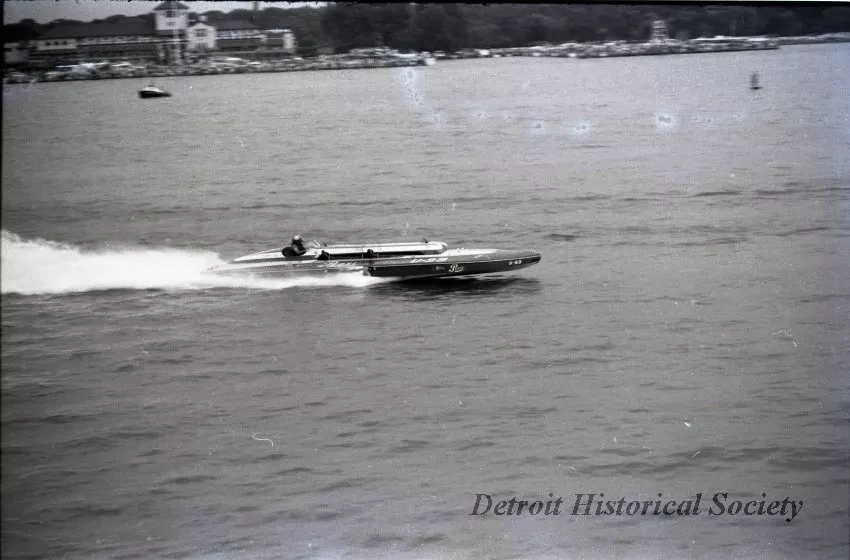 Black and white negative of MISS PEPSI, driven by Chuck Thompson, taken during the final heat of the 1956 Gold Cup Race on the Detroit River. The boat finished second in the final heat and second overall.