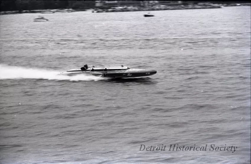 Black and white negative of MISS PEPSI, driven by Chuck Thompson, heading down the Detroit straightaway, taken during the final heat of the 1956 Gold Cup Race on the Detroit River. The boat finished second in the final heat and second overall. The Detroit Yacht Club can be seen in the background.