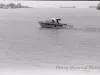 Black and white negative of a racecourse officials boat, taken during the 1966 Gold Cup Race on the Detroit River. The U.S. Coast Guard cutter BRAMBLE can be seen in the background at right, and a lake freighter, headed up river into Lake St. Clair, at left.