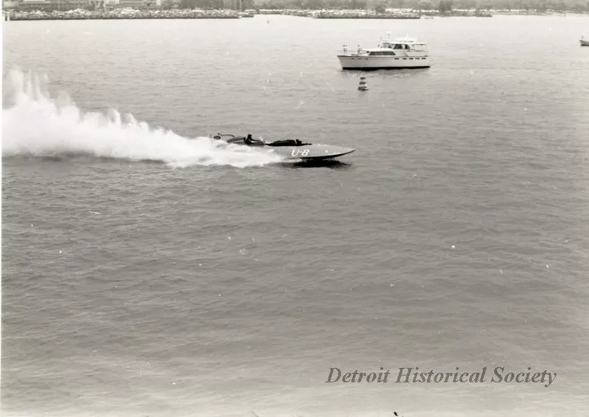 Black and white negative of MISS DIXI COLA, driven by Fred Alter, at the 1966 Gold Cup Race on the Detroit River. The boat finished second overall.