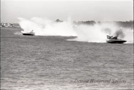 Black and white negative taken at the 1967 World Championship Race on the Detroit River of MISS CHRYSLER CREW (at left), driven by Bill Sterett, and SAVAIR'S MIST, driven by Walter Kade (at right). MISS CHRYSLER CREW won the race, and SAVAIR's MIST finished fifth overall.
