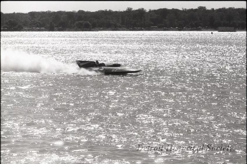 Black and white negative taken during the 1965 Spirit of Detroit Race on the Detroit River of MISS U.S. 5, which was driven by Roy Duby. The Belle Isle shoreline can be seen in the background. The boat finished fourth overall in the race.