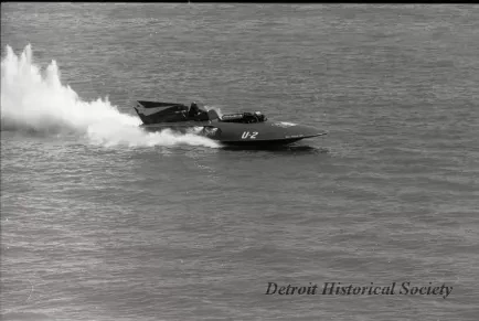 Black and white negative taken during the 1965 Spirit of Detroit Race on the Detroit River of MISS U.S. 5, driven by Roy Duby. The boat finished fourth overall in the race.