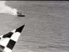 Black and white negative taken during the 1965 Spirit of Detroit Race on the Detroit River of MISS U.S. 5, which was driven by Roy Duby, receiving the checkered flag. The boat finished fourth overall.