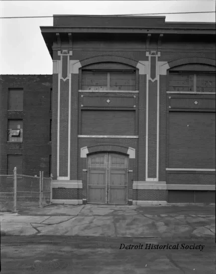Black and white film negative depicting a chain-link gate in front of double wooden doors at the Detroit Edison Hart Substation, on the west side of Hart Avenue.