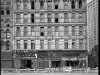Black and white film negative of an abandoned five-story structure located at 30 Monroe Avenue, a component of the Second Williams Block; components of the façade have depreciated and windows are missing and boarded up. In the background are Cadillac Tower and the First National Building.
