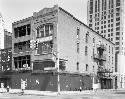 Black and white film negative of 100-102 Monroe Avenue, at the southeast corner of Farmer Street and Monroe Avenue; the abandoned commercial structure was once part of the Monroe Block; the perimeter of the building is boarded up, and signs from the Monroe Lunch and Adriatic Grocery, remain intact. In the background is the Water Board Building.