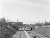 Black and white film negative depicting the Davison Freeway in Highland Park, looking west from the Second Avenue Bridge.