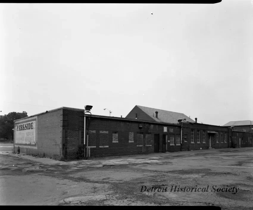 Black and white film negative depicting the Parkside Homes administrative building at 12515 E Warren Avenue.