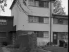 Black and white film negative of the abandoned Parkside Homes public housing project, in an area bounded by Connor Avenue, Frankfort Road and Zachariah Chandler Park; the World War II era building appears inhabited, waste receptacles are visible as well as window dressings, and decorations.