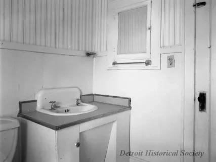 Black and white film negative looking west from the north bound traffic lanes of Telegraph Road, toward the abandoned brick and mortar multi-family dwellings.