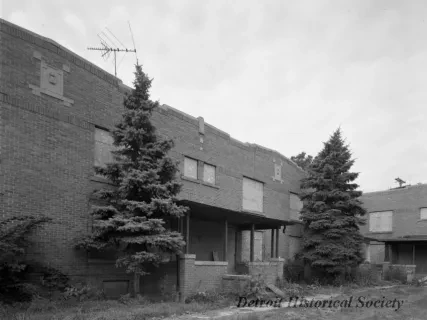 Black and white film negative of the façade detailing, including porch, and first and second stories of the multi-family brick and mortar structures, located on the west side of north bound Telegraph Road in Waterford.