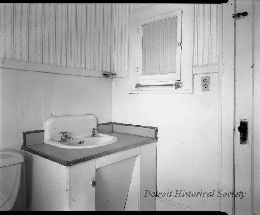 Black and white film negative of an interior view of a bathroom inside an abandoned apartment home located on Telegraph Road in Waterford; a sink, vanity, and commode are visible.