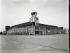 Black and white film negative depicting the southwest facade of Hangar No. 1 at Grosse Ile Municipal Airport, looking northeast.