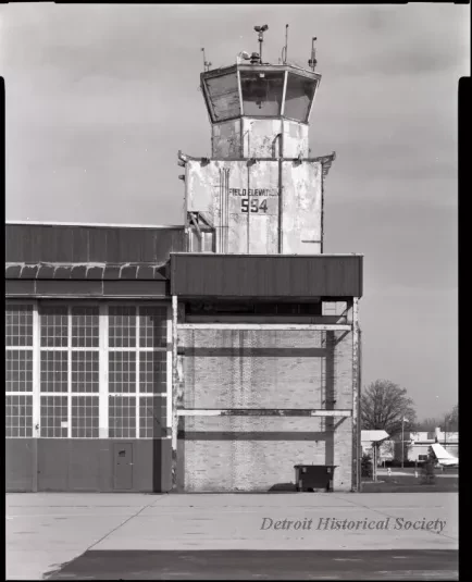 Black and white film negative depicting the south facade of the southeast tower at Hangar No. 1 at Grosse Ile Municipal Airport, looking north.