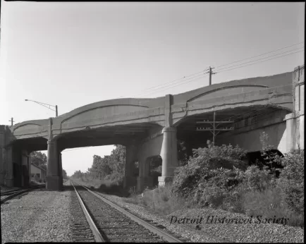 Black and white film negative depicting the north elevation of the Grand River Avenue Bridge in Novi, looking southwest. It spans the Chesapeake & Ohio Railroad. In the background to the left is the Novi Train Depot.