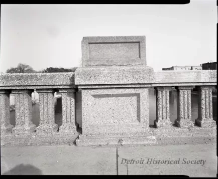 Black and white film negative depicting a detail of a pier pilaster, flower box and spindles on the east railing of the Monroe Street Bridge in Monroe, looking east.