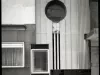 Black and white film negative depicting a display window and Art Deco detailing near the entrance to the Fox Building on the south side of Quay Street in Port Huron.