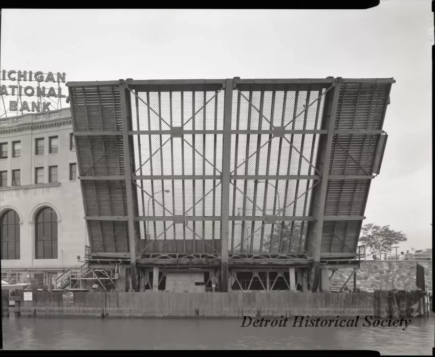Black and white film negative depicting the south leaf of the Military Street Bridge in Port Huron in the raised position. To the left is the Michigan National Bank Building. In the foreground is the Black River.
