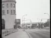 Black and white film negative depicting the east sidewalk and deck of the Military Street Bridge in Port Huron, looking south. To the left is the Michigan National Bank Building. In the background is the Times Herald Building.