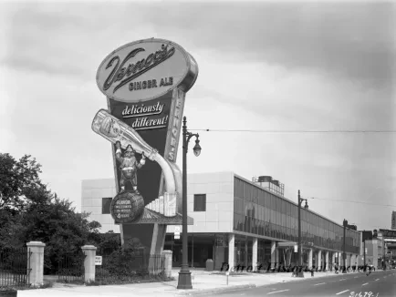 Negative. Black and white negative showing a ground-level view of the front of the Vernor's Ginger Ale plant at 4501 Woodward Avenue. The view looks northwestward with Woodward Avenue and the Vernor's Ginger Ale sign in the foreground. The 2-story plant can be seen in the background. The number, "31679-1," is printed in the lower right corner.
