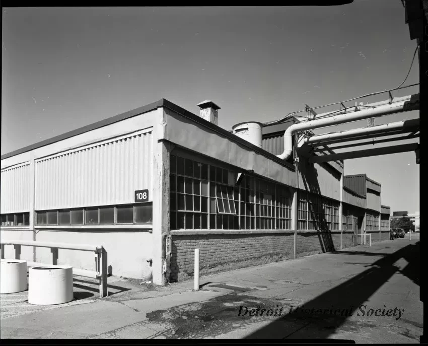 Black and white film negative depicting the west side of Building No. 108, the engineering garage at the Chrysler Center in Highland Park.