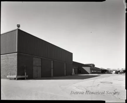 Black and white film negative depicting the north side of Plant No. 4 (Service Machinery Building) at the Chrysler Center in Highland Park.