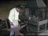Color negative taken of Carlton Matteo demonstrating blacksmithing techniques in Fort Wayne's blacksmith shop. He stands, wearing Union army kepi, over the shop's anvil with a hammer in one hand and a tongs in the other. A fire burns on the forge in the background. The shop's grindstone is visible behind him. The film was previously housed in a GK Photographics envelope, with "AAA 4-20-88, Fort Wayne," handwritten on it.