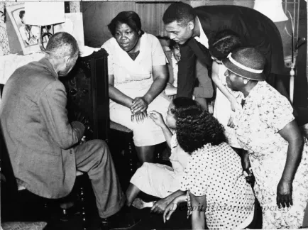 Negative. Black and white negative of a print which shows Joe Louis' family gathered around a radio to listen to the fight between Louis and Max Baer on September 24, 1935. Louis' stepfather Patrick Brooks is at the left with his back to the camera, and Louis' mother Lillie Barrow is at the second-from-left.
