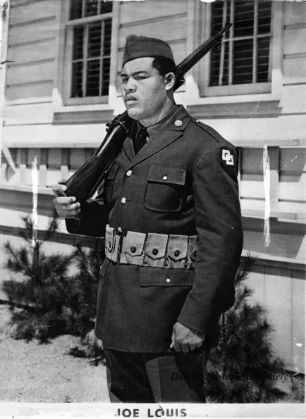Negative. Black and white negative of a print which shows Joe Louis wearing a U. S. Army uniform with a patch on his left shoulder for the 2nd Service Command. He is holding a rifle on his right shoulder. A white wood frame building can be seen in the background. The name, "Joe Louis," is printed in black text on the lower edge of the image.