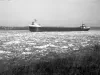 Negative. Black and white negative showing a view of the port side of the SS Edmund Fitzgerald. The vessel is underway (upbound) in icy water on the St. Clair River as seen from the shore just north of St. Clair. The Canadian shore is visible in the background.