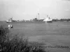Negative. Black and white negative showing a view of the starboard side of the SS Edmund Fitzgerald. The vessel is underway (downbound) in fair weather on the St. Clair River as seen from the shore just south of St. Clair, Michigan. Some shoreline brush is visible in the lower left foreground. The Canadian shoreline and an industrial plant are visible in the background.