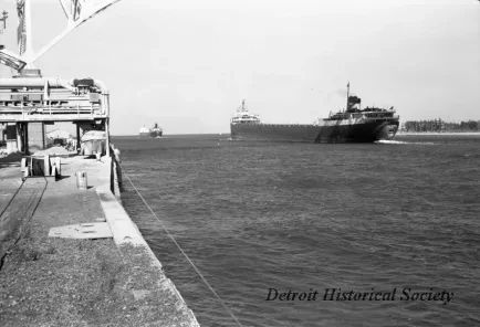 Negative. Black and white negative showing a view of the port side quarter of the SS Edmund Fitzgerald. The vessel is underway (upbound) in fair weather on the St. Clair River as seen from Port Huron. A concrete dock and seawall are visible in the left foreground and one of the structural foundations for the Blue Water Bridge can be seen in the left background. The Canadian shoreline can be seen at the far right side of the photo. Another upbound steamship is visible in the distance ahead of the SS Edmund Fitzgerald although the name on this vessel is not readable.