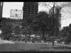 Black and white film negative showing Grand Circus Park and adjacent buildings. The view is looking northward across the park to the buildings on West Adams Street which include the Adams Theatre, Grand Park Centre Building (under construction), and the Fyfe Building.