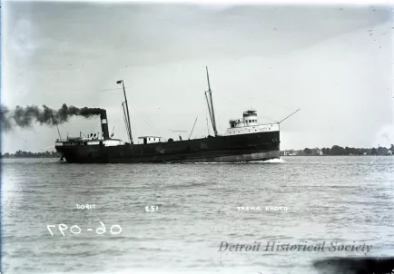 Negative, glass-plate. Monochromatic glass-plate negative from the studio of Louis James Pesha depicting starboard side of the Northern Navigation Company, Grand Trunk line freighter DORIC, under steam. A crew member stands on deck. A tree-lined shoreline, dotted with houses, is visible in the background.