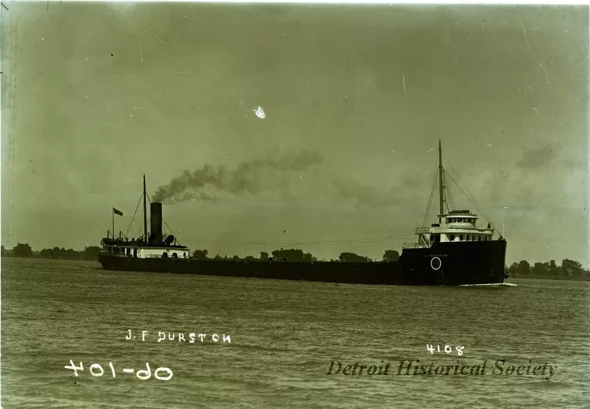 Negative, glass-plate. Monochromatic glass-plate negative from the studio of Louis James Pesha depicting starboard side of the Great Lakes Steamship Company freighter J.F. DURSTON, under steam. A crew member is on the promenade in front of the pilot house, while another stands below at the bow. Two more crew members are seated near the aft cabin. A tree-lined shoreline is visible in the background.