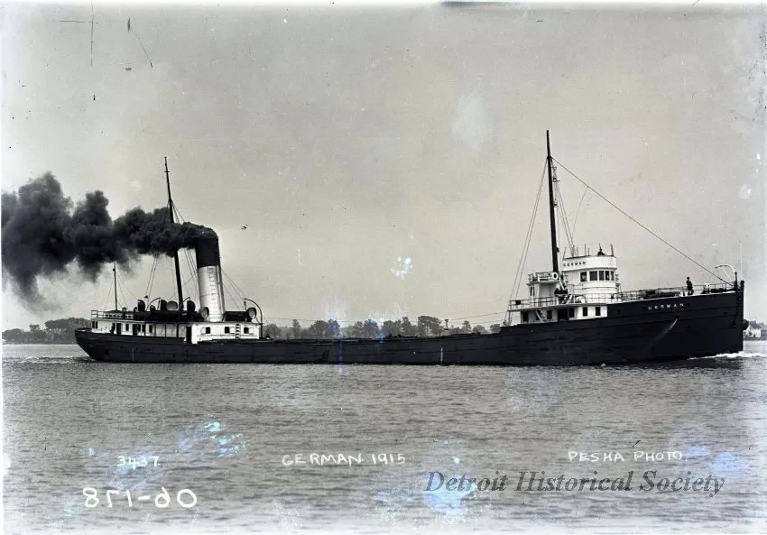 Negative, glass-plate. Monochromatic glass-plate negative from the studio of Louis James Pesha depicting the starboard side of the Pittsburgh Steamship Company freighter GERMAN, under steam. A crew member stands at the bow, another on the flying bridge, and a third at the stern. A tree-lined shoreline, dotted with houses, is visible in the background. The image is captioned, "1915."