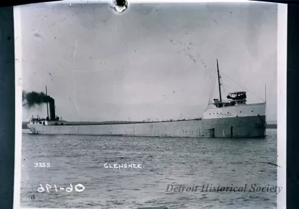 Monochromatic glass-plate negative from the studio of Louis James Pesha taken of a photographic print of the starboard side of the Great Lakes Transportation Company freighter GLENSHEE, under steam. A figure walks along the deck. A tree-lined shoreline is visible in the background.