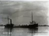 Monochromatic glass-plate negative from the studio of Louis James Pesha depicting the port side of the Western Navigation Company freighter J.S. KEEFE, under steam. Two figures stand on the flying bridge. Several small buildings along a tree-lined shoreline are visible in the background. The image is captioned with the date, 1916.