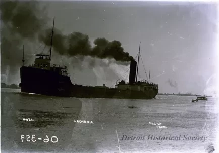 Monochromatic glass-plate negative from the studio of Louis James Pesha depicting the bow and port side of the Interlake Steamship Company freighter LAGONDA, under steam. Three figures are on the flying bridge, and three others are below outside of the pilot house. A figure stands in the doorway of the pilot house. Two small motorboats are in the wake of the LAGONDA. One carries a man and a woman, and the other has several people beneath a canopy. A tree-lined shoreline is visible in the background.