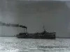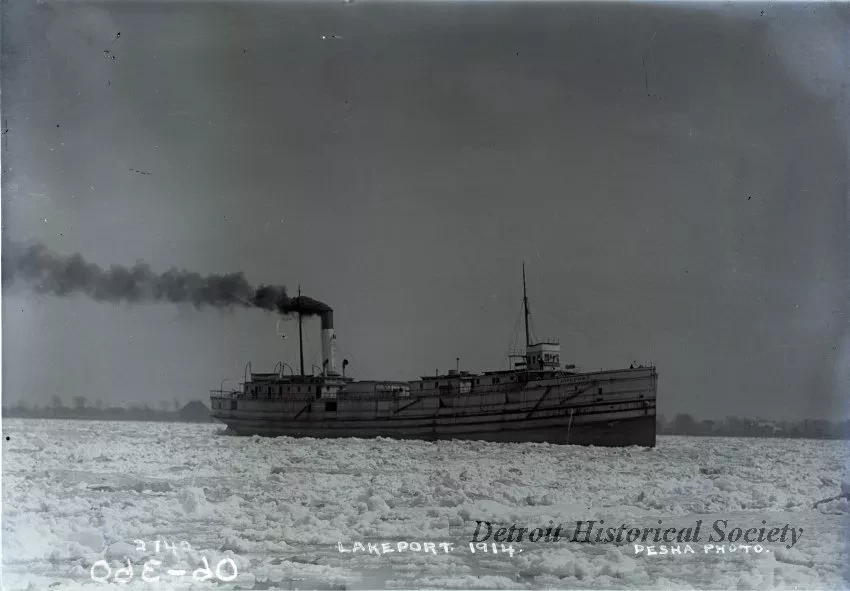 Monochromatic glass-plate negative from the studio of Louis James Pesha depicting the starboard side of the Port Huron and Duluth Steamship Company steamer LAKEPORT, under steam along a frozen waterway. Figures are visible on board at the bow, outside the pilot house, and outside the aft cabin. Several buildings along a tree-lined shoreline are in the background. The image is captioned with the date, 1914. The non-archival envelope which previously housed the plate included the following hand-written details:
