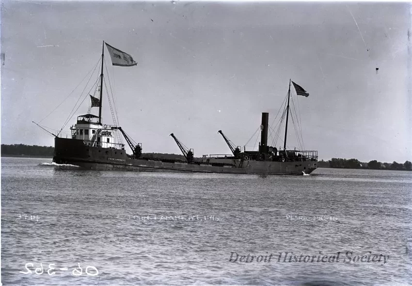 Monochromatic glass-plate negative from the studio of Louis James Pesha depicting the port side of the Great Lakes and St. Lawrence Transportation Company freighter JOHN LAMBERT, under steam. Two figures are on the flying bridge, and two others are near the stern. A tree-lined shoreline is visible in the background. The image is captioned with the year, 1916. "63-13-#2, 3194," was handwritten on the non-archival envelope which previously held the plate.
